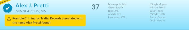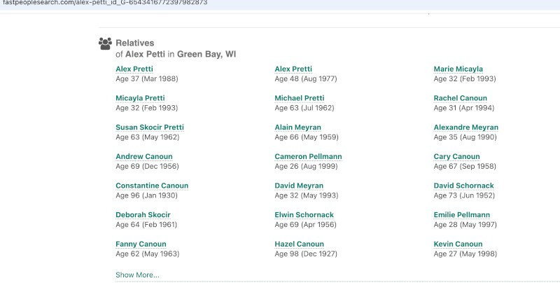 Even stranger, we find a fourth person of nearly the same name linked to this family, Alex Petti, 63, of Green Bay. FastPeopleSearch has all the same relatives for him and Alex Pretti, 37: